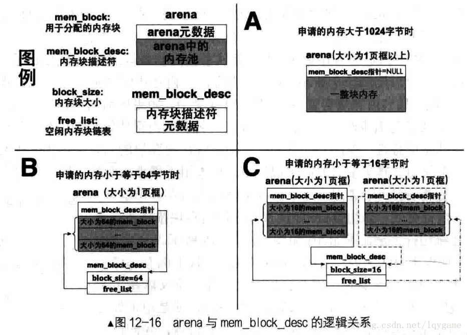 每个内存块命名为mem_block,分别为每一种规格的内存块建立一个内存块描述符即mem_bloc_desc。