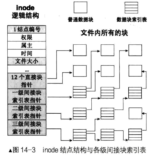 用索引来查找数据块,在UNIX系统中,一个文件必须对应一个inode(索引表),磁盘中有多少文件就有多少个inode。inode的结构如下如图,前12个索引为直接指针,后面的3个为间接索引的地址。每个间接索引表都可存256个块。