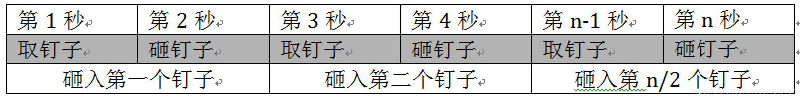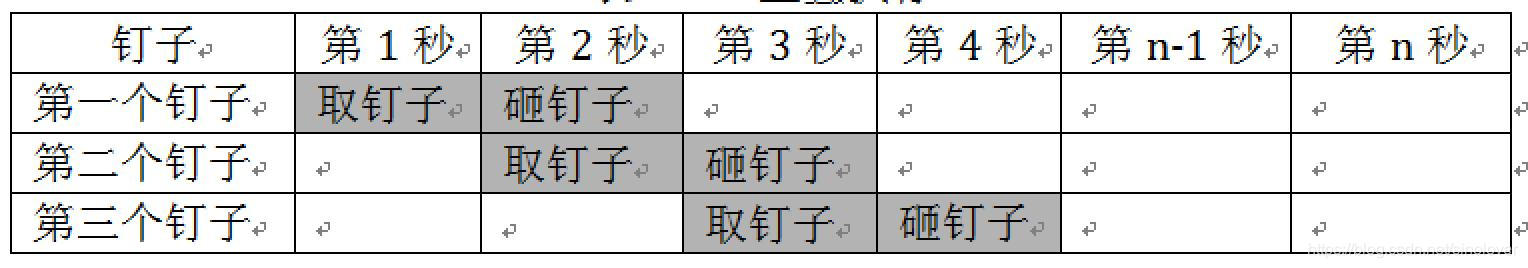 如果以“并行”的方式,也就是同时砸钉子,那得多增加人手才行,一个人同时只能做一件事,并且要么拿钉子,要么砸钉子。下面给砸钉子的工作增加个人手,专门给取钉子,这样一个人取钉子,另一个人专门来砸钉子,取钉子和砸钉子的工作重叠进行,过程如表: