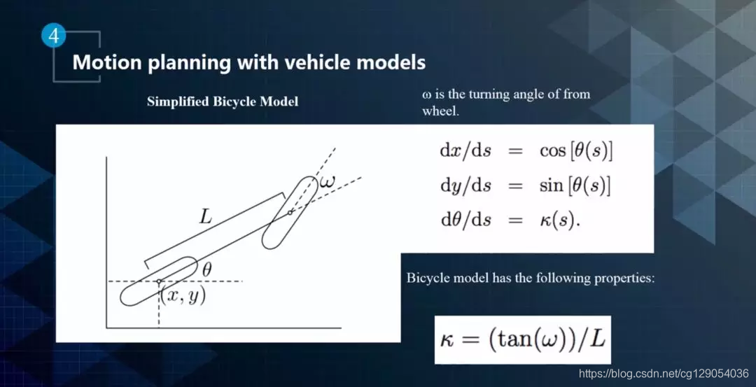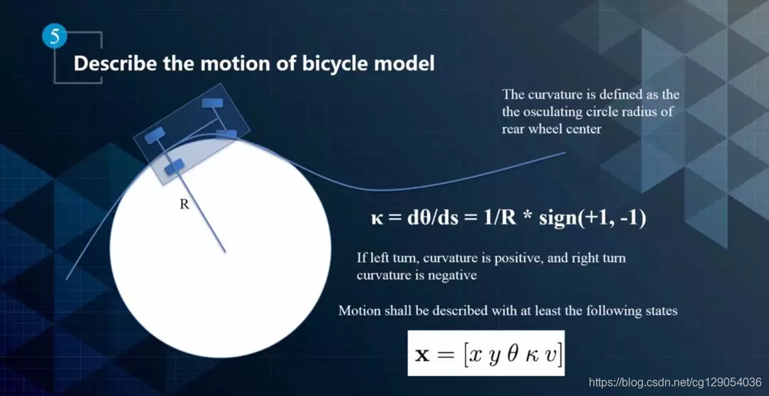 在实际的自行车运动模型中,后轴中心是沿着如上图所示的一条平滑的轨迹运行,该轨迹对应的曲率表示调整方向盘的度数,如果为正,表示向左转,反之则向右转。因此,自行车运动模型可以用