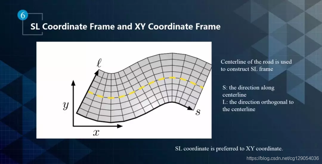 SL坐标系也叫做frenet frame,如下所示。它以道路中心线为参考,S表示道路中心线的方向,L表示与道路中心线垂直的方向。在结构化道路上行驶的时候,SL坐标系比XY坐标系更加贴合实际需求。那么SL坐标系如何转换到XY坐标系呢?
