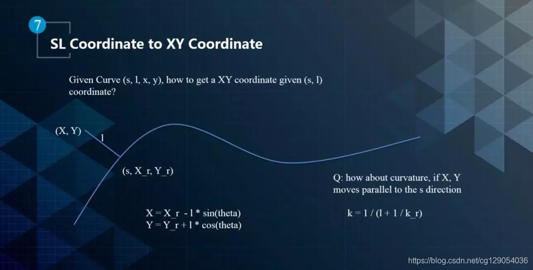 之所以要投影到世界坐标系,是因为很多信息是全局的,例如红绿灯位置,参考的是XY世界坐标系。在给定SL坐标系时,每一个点的S坐标本身对应一个坐标,根据该点的横向偏移距离,可以求出给定点在世界坐标系中的XY位置,如下图所示。其中theta是参考线的方向,也就是切线方向。如果XY与S方向平行的话,轨迹的曲率还满足图中所示的关系。