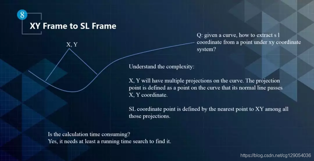 对于一个给定的曲线,如何将XY坐标系下的点转换到SL坐标系呢?因为SL坐标系并不是唯一的,XY会在曲线上产生很多投影,投影点是经过XY坐标,且垂直于曲线的线段与曲线的交点,如下图所示,XY就有两个投影点。通常情况下会增加一些限制,例如投影距离不能超曲率值。需要注意的是,掉头的时候还是需要特殊处理的。