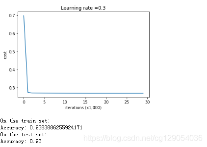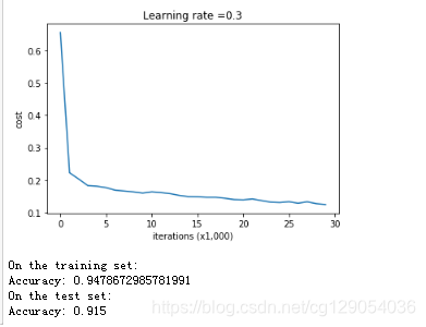 def model(X, Y, learning_rate = 0.3, num_iterations = 30000, print_cost = True, lambd = 0, keep_prob = 1):"""Implements a three-layer neural network: LINEAR->RELU->LINEAR->RELU->LINEAR->SIGMOID.Arguments:X -- input data, of shape (input size, number of examples)Y -- true "label" vector (1 for blue dot / 0 for red dot), of shape (output size, number of examples)learning_rate -- learning rate of the optimizationnum_iterations -- number of iterations of the optimization loopprint_cost -- If True, print the cost every 10000 iterationslambd -- regularization hyperparameter, scalarkeep_prob - probability of keeping a neuron active during drop-out, scalar.Returns:parameters -- parameters learned by the model. They can then be used to predict."""grads = {}costs = [] # to keep track of the costm = X.shape[1] # number of exampleslayers_dims = [X.shape[0], 20, 3, 1]# Initialize parameters dictionary.parameters = initialize_parameters(layers_dims)# Loop (gradient descent)for i in range(0, num_iterations):# Forward propagation: LINEAR -> RELU -> LINEAR -> RELU -> LINEAR -> SIGMOID.if keep_prob == 1:a3, cache = forward_propagation(X, parameters)elif keep_prob < 1:a3, cache = forward_propagation_with_dropout(X, parameters, keep_prob)# Cost functionif lambd == 0:cost = compute_cost(a3, Y)else:cost = compute_cost_with_regularization(a3, Y, parameters, lambd)# Backward propagation.assert(lambd==0 or keep_prob==1) # it is possible to use both L2 regularization and dropout, # but this assignment will only explore one at a timeif lambd == 0 and keep_prob == 1:grads = backward_propagation(X, Y, cache)elif lambd != 0:grads = backward_propagation_with_regularization(X, Y, cache, lambd)elif keep_prob < 1:grads = backward_propagation_with_dropout(X, Y, cache, keep_prob)# Update parameters.parameters = update_parameters(parameters, grads, learning_rate)# Print the loss every 10000 iterationsif print_cost and i % 10000 == 0:print("Cost after iteration {}: {}".format(i, cost))if print_cost and i % 1000 == 0:costs.append(cost)# plot the costplt.plot(costs)plt.ylabel('cost')plt.xlabel('iterations (x1,000)')plt.title("Learning rate =" + str(learning_rate))plt.show()return parameters