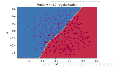 # GRADED FUNCTION: backward_propagation_with_regularizationdef backward_propagation_with_regularization(X, Y, cache, lambd):"""Implements the backward propagation of our baseline model to which we added an L2 regularization.Arguments:X -- input dataset, of shape (input size, number of examples)Y -- "true" labels vector, of shape (output size, number of examples)cache -- cache output from forward_propagation()lambd -- regularization hyperparameter, scalarReturns:gradients -- A dictionary with the gradients with respect to each parameter, activation and pre-activation variables"""m = X.shape[1](Z1, A1, W1, b1, Z2, A2, W2, b2, Z3, A3, W3, b3) = cachedZ3 = A3 - YdW3 = 1./m * np.dot(dZ3, A2.T) + lambd / m * W3db3 = 1./m * np.sum(dZ3, axis=1, keepdims = True)dA2 = np.dot(W3.T, dZ3)dZ2 = np.multiply(dA2, np.int64(A2 > 0))dW2 = 1./m * np.dot(dZ2, A1.T) + lambd / m * W2db2 = 1./m * np.sum(dZ2, axis=1, keepdims = True)dA1 = np.dot(W2.T, dZ2)dZ1 = np.multiply(dA1, np.int64(A1 > 0))dW1 = 1./m * np.dot(dZ1, X.T) + lambd / m * W1db1 = 1./m * np.sum(dZ1, axis=1, keepdims = True)gradients = {"dZ3": dZ3, "dW3": dW3, "db3": db3,"dA2": dA2,"dZ2": dZ2, "dW2": dW2, "db2": db2, "dA1": dA1, "dZ1": dZ1, "dW1": dW1, "db1": db1}return gradients