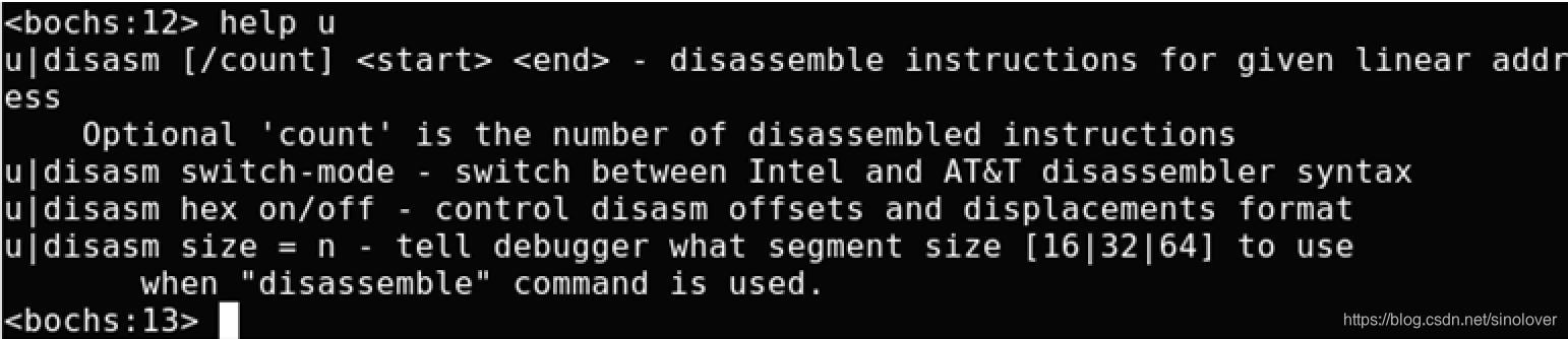 大概意思是说,u和disasm是一样的命令,用哪个都行,其用法是在后面跟需要汇编的指令数,起始线性地址,终止线性地址。由于我们在实模式下,线性地址就是物理地址。键入 u/1 0xffff0回车,效果如图: