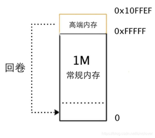 答案说出来吓你一跳:不用处理,哈哈。您想,8086一共就20条地址,地址线是从0开始的,即A0~A19,所以其地址空间才是1M的啊。内存地址0xFFFFF+是要用到A20地址线,可是8086它没有啊,只能接收20位长的地址。所以由于超过了20位而产生的进位,就给丢掉了。其作用相当于把地址对1M取模了。举例,如0xFFFFF+2,理论上是变成了0x100001。但由于只能容纳20位长的数据,所以最终结果是0x00001。这是地址回卷的效果:即超过最大范围后,从0重新开始计数。回卷英文称为wrap-around,示意如图