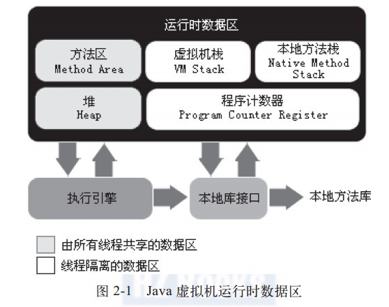 | 方法区 | 线程共享 | OutOfMemoryError异常 | 用于存储已被虚拟机加载的类信息、常量、静态变量、即时编译器编译后的代码等数据。和Java堆有相似特性,但不是垃圾回收的主要区域 |