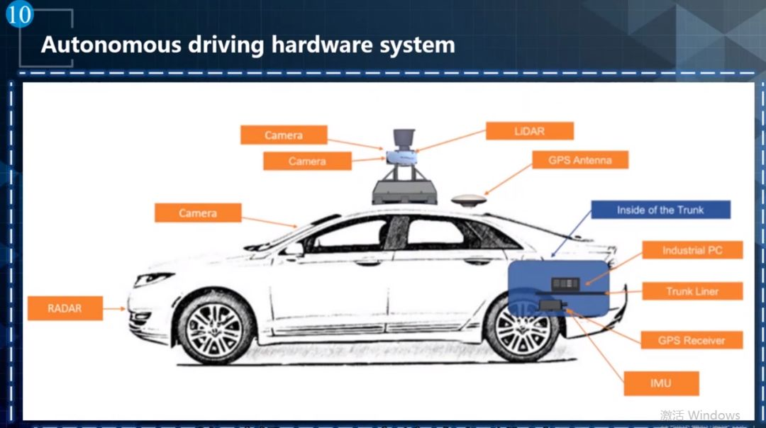 无人车硬件系统除了汽车之外,还涉及很多传感器,传感器感知汽车周围环境,即使是这样也只是部分搜索环境。还有 GPS 接收器可以做定位,以及 IMU 惯性导航系统,如上图所示。