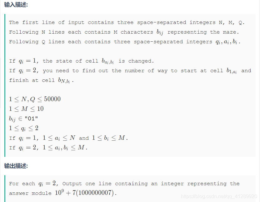 {cin>>n>>m>>q;for(int i = 1; i<=n; i++) {for(int j = 1; j<=m; j++) scanf("%1d",&a[i][j]);}build(1,n,1);while(q--) {int op,x,y;scanf("%d%d%d",&op,&x,&y);if(op == 1) a[x][y] ^= 1,update(x,1);else printf("%lld\n",tr[1].m[x][y]%mod);}return 0 ;