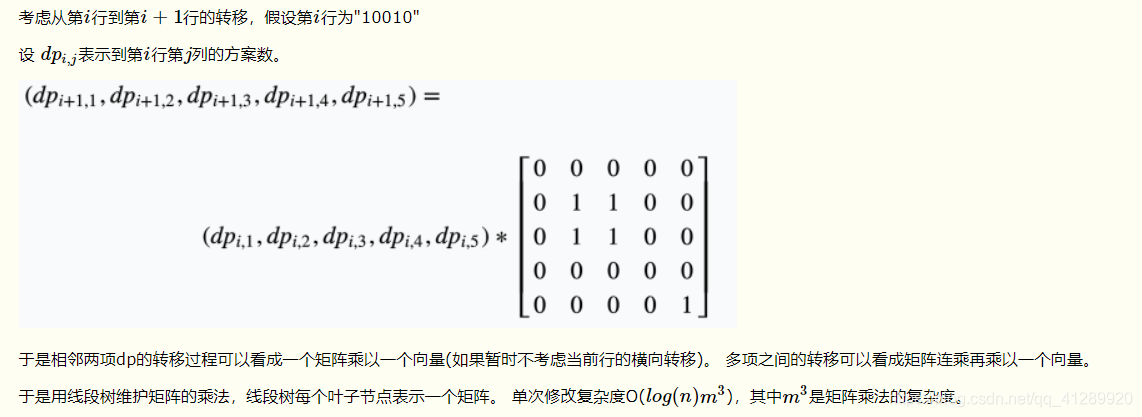 因此第 i 行的 dp 值到第 i + 1 行的 dp 值的转移可用矩阵 Mi 实现;