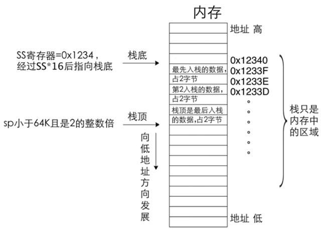 栈既然是一片内存区域,访问内存就要用“段基址:段内偏移地址”的形式,所以栈中的内存地址也是用“段基址SS的值*16+栈指针SP(段内偏移地址)形成的20位地址”访问到的。由于是硬件实现的栈,故硬件提供了相应的方法来存取栈,即push和pop指令。push指令负责把数据压入栈,pop指令功能相反,将其从栈中取出。不过我刚才说的不全面,栈的出口和入口都是栈顶,push把数据压向哪里,它得知道栈顶在哪里才行。pop指令也一样,它得知道哪里是栈顶才能从栈中取出正确的数据。这正是栈指针寄存器SP的作用,此寄存器中的值是段内偏移地址,是栈顶相对于栈底的偏移量。