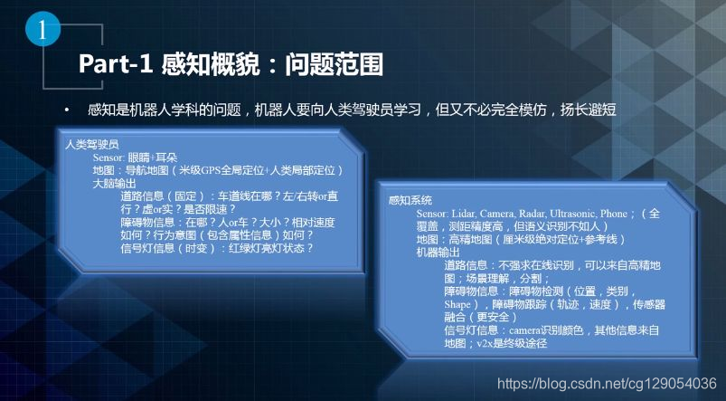 输出信息的比较,人类驾驶员的感知信息输出主要是大脑输出,一是道路信息,包括车道线位置,是左转还是右转车道,是否限速,实线还是虚线等。第二是动态障碍物信息,主要包括障碍物位置、类别、形状大小、相对速度、行为意图等。除此之外,人还需要通过眼睛感知交通信号灯的状态。无人车感知的信息输出主要是各个传感器的数据,固定目标更多的是依赖高精地图,减少在线识别。