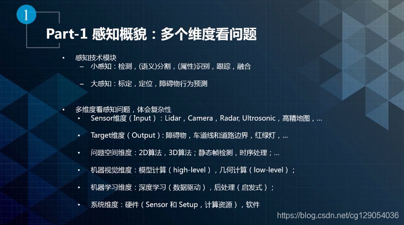 感知模块可以从小感知和大感知两个维度进行划分。小感知主要是完成感知任务需要具备的功能模块,包括检测、分割、识别、跟踪、融合等技术。大感知是指感知要真正的为无人车系统服务,需要考虑上下游,例如标定,定位,障碍物行为预测等,也是当前的一种研发趋势。