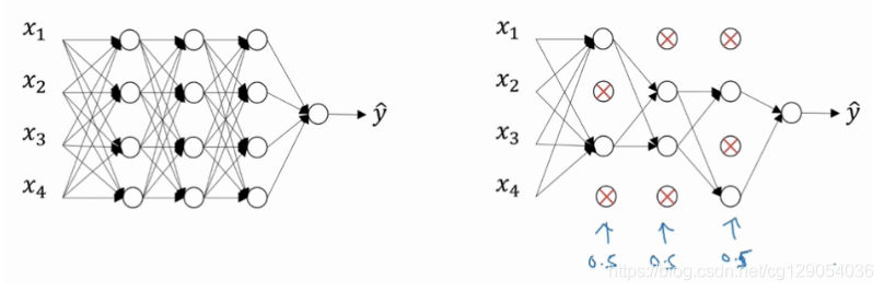 除了L2正则化,还有一种防止过拟合的有效方法:Dropout。dropout(随机失活)是在神经网络的隐藏层为每个神经元结点设置一个随机消失的概率,保留下来的神经元形成一个结点较少、规模较小的网络用于训练。dropout 正则化较多地被使用在计算机视觉(Computer Vision)领域。下图为概率为0.5的Dropout的正则化例子。