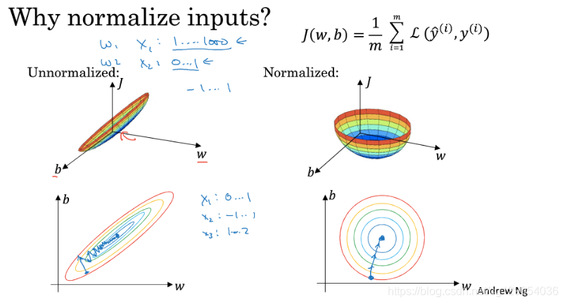 有图可知,使用标准化输入前后,成本函数的形状有较大改变。