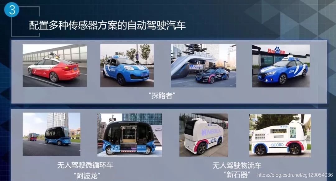 下面的四辆车分为两种车型,一种叫做无人驾驶微循环车,一种叫无人驾驶物流车。无人驾驶微循环车是和厦门金融合作,叫阿波龙。它配备了一个很便宜的惯导。激光雷达用了16线,再加上一些双目摄像头。右边的无人驾驶物流车,是和新石器一起开发的,一般情况下可以用于小区的无人快递车或者是广场上面去卖饮料的无人车。