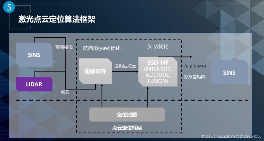 激光点云定位系统包括两个模块:图像对齐和SSD HF。图像对齐模块主要是用于航向角的优化。点云定位里面会输出四个维度的信息,XYZ和Yaw(航向角)。