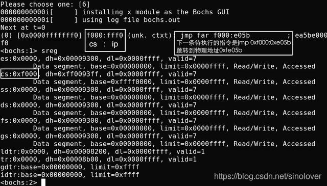 既然此处只有16字节的空间了,这只能说明bios真正的代码不在这,那此处的代码只能是个跳转指令才能解释得通了。好,既然心里有了推断,那咱们就来证明这个推断正确与否。下图是我在bochs中抓的图,下面给大家分析一下这图中的信息都代表什么。