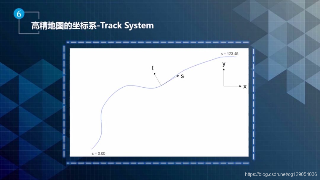 Track坐标系是基于st的,如上图所示。s是纵向,t是横向。这个坐标系用来表述一个元素跟Lane之间关系,描述它位于Lane的什么位置,相对于Lane起点的偏移量是多少。