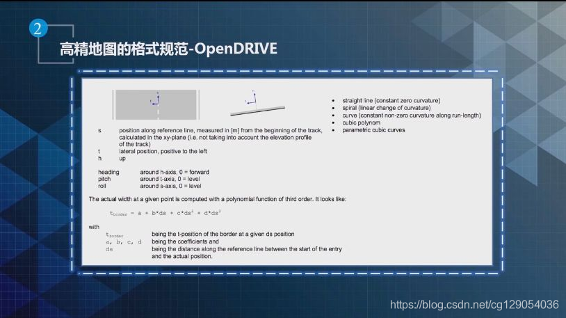 这个车道线可以通过方程来描述,其他属性如车道线左右的坡度,也可以通过一个基于Reference Line偏移的方程来描述。