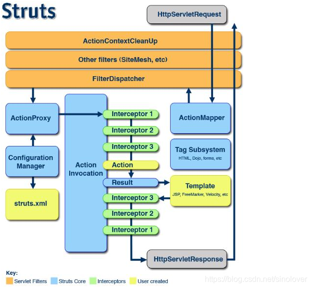 在上述过程中所有的对象(Action,Results,Interceptors,等)都是通过ObjectFactory来创建的