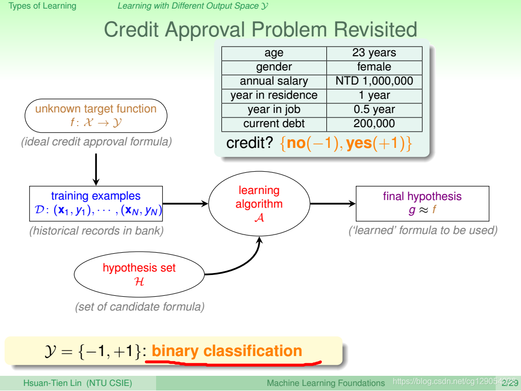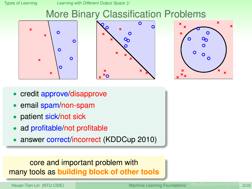上节课中,我们学习了银行批发信用卡的例子,这是一个典型的二分类问题。输出只有两种情况。二分类问题可以说是机器学习中最基础也是最常见的问题,常见的有垃圾邮件判别,患者疾病诊断等等。二元分类有线性模型和非线性模型。