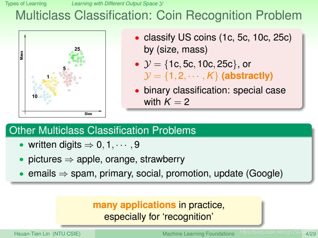 除了二元分类,常见的还有多元分类问题。即输出类别多于两个。如:硬币分类,手写数字分类,图片分类,邮件分类等。