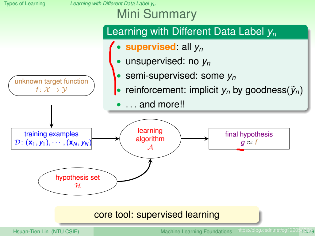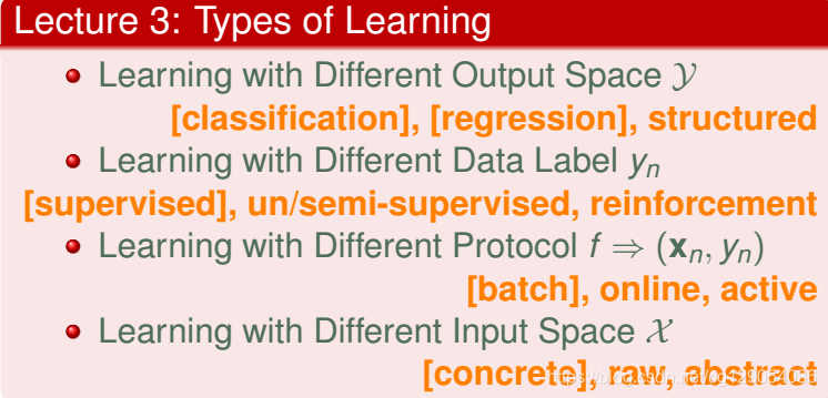 在上一节课中,我们学到了第一个机器学习算法:PLA。它属于分类算法。在本节课中我,我们主要了解机器学习的种类。