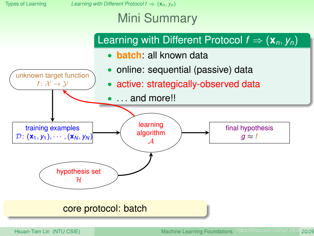 Online是一种在线学习模型,数据实时更新。随着数据的不断增加,我们也在同步更新算法。如之前介绍的PLA算法和强化学习等。