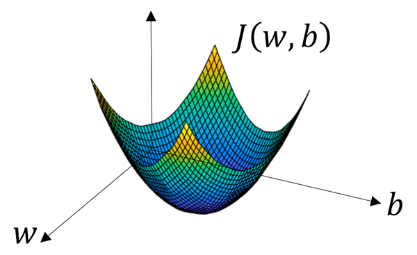 模型的训练目标即是寻找合适的 w 与 b 以最小化代价函数值。简单起见我们先假设 w 与 b 都是一维实数,那么可以得到如下的 J 关于 w 与 b 的图: