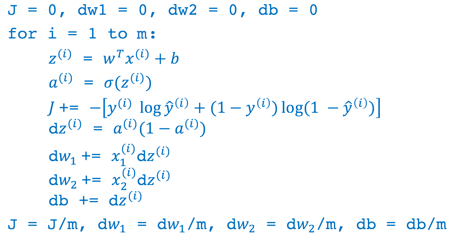 在 Logistic 回归中,需要计算如果是非向量化的循环方式操作,代码可能如下:
