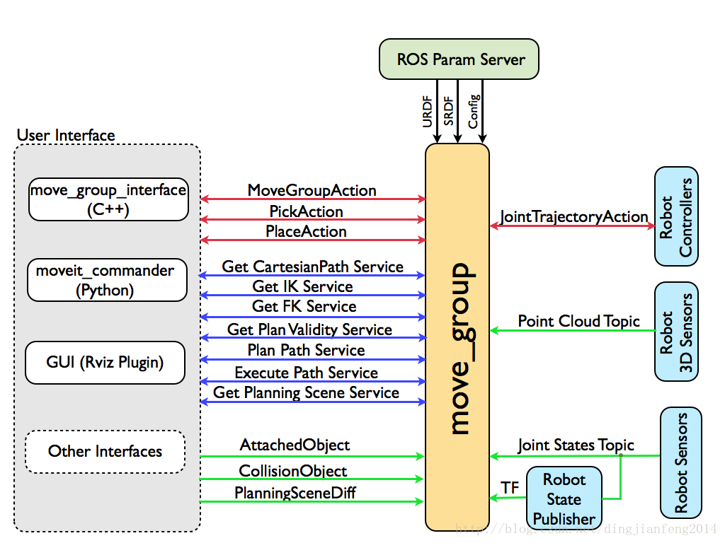 1.move_group:move_group是moveit的核心部分,可以综合机器人的各独立组件,为用户提供一系列的动作指令和服务。move_group类似于一个积分器,本身并不具备丰富的功能,主要做各功能包和插件的集成。它通过消息或服务的形式接收机器人上传的点云信息,joints的状态消息,还有机器人的tf tree,另外还需要ros的参数服务器提供机器人的运动学参数,这些参数会在使用setup assistant的过程中根据机器人的URDF模型文件,创建生成,包括SRDF文件和配置文件。