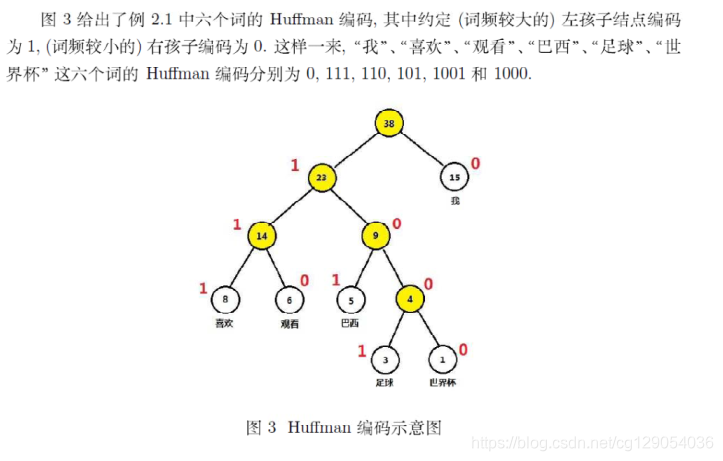 - 输出层:输出层对应的是一棵Huffman树。该Huffman树以语料中出现的词为叶子节点,以各词在语料中出现的次数当做权值构造出来的。该树中,叶子节点总共有N个。