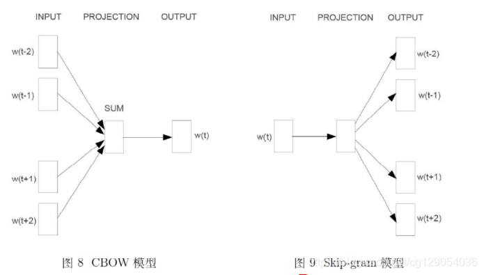 现在开始正式介绍word2vec中用到的两个重要模型----CBOW模型和Skip-pram模型。下面是两个模型的示意图,两个模型都包含输入层、投影层、输出层。前者是在已知当前词的上下文的前提下预测当前词;后者恰恰相反,是在已知当前词的前提下预测上下文。