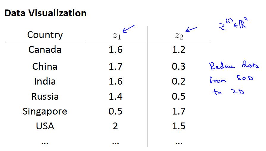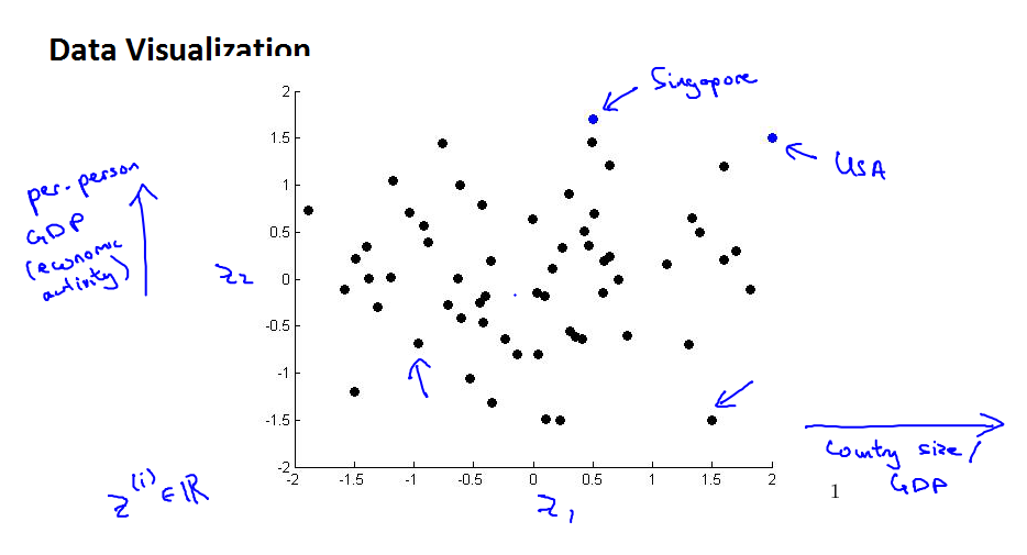 无监督学习第二个算法:降维,降维有两个目的:1是数据压缩,2是可视化,数据压缩就是减少特征。工业中我们常常会碰到上万的特征,这是我们就需要压缩数据,找出其中重要的特征。下面是3维压缩为2维的例子: