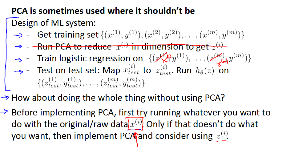 主成分分析是最小化投射误差,线性回归是最小化预测误差。下图左面是线性回归,右边是主成分分析。