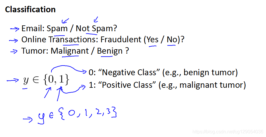 在分类问题中,我们要预测的变量 y 是离散的值,我们预测的结果是否属于一个类,以下是几种常见的分类例子: