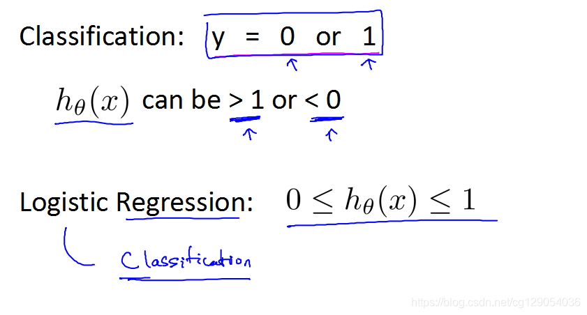 在线性回归中,我们预测值 y 既可能大于1也可能小于0,但在逻辑回归中我们希望输出值在0到1之间。要提醒的是,虽然这叫做逻辑回归算法,但是它是分类算法,不是回归算法。