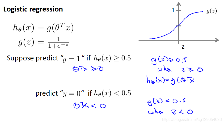 来回顾一下我们之前的假设,由 g(z) 函数图像可知,如果希望预测为1,则输入值大于等于0,反之小于0,如图所示: