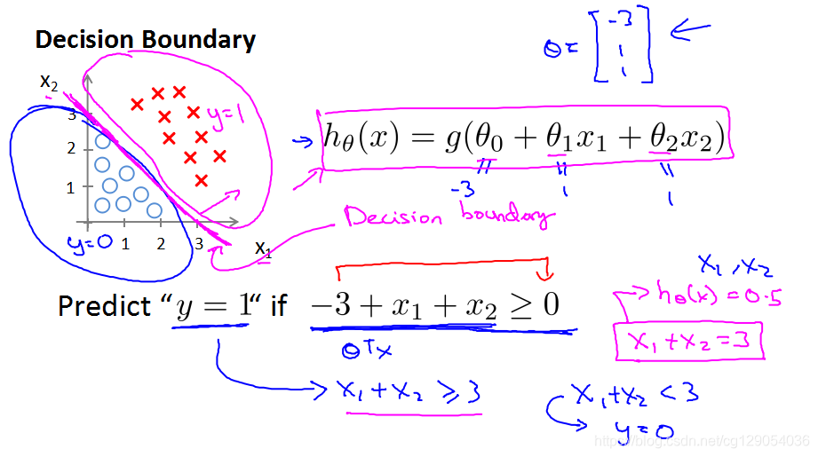 我们来看两个例子,下图介绍了当希望预测为1时对应的数据集判定边界。下图对应的判定边界为一条直线,直线上方的数据判定为1,下方的数据判定为0。