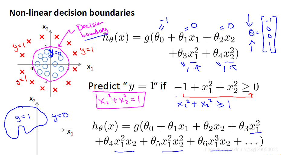 下图为一个复杂的判定边界,边界为半径1的圆,圆内的判定为0,圆外侧的判定为1,这已经有点SVM核函数的概念了,我们后面会介绍到。