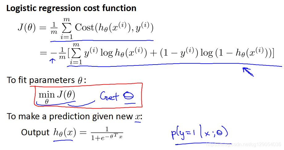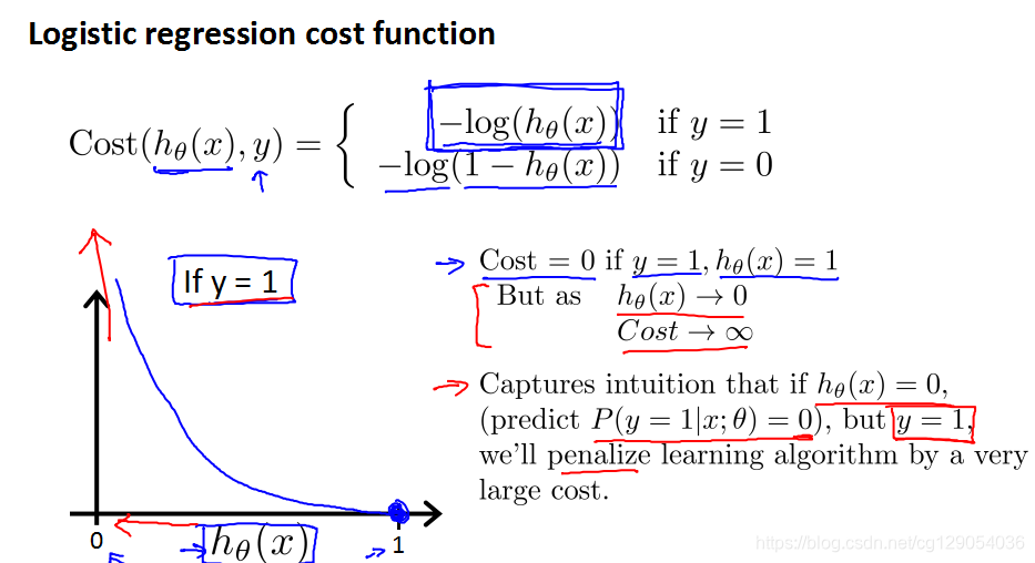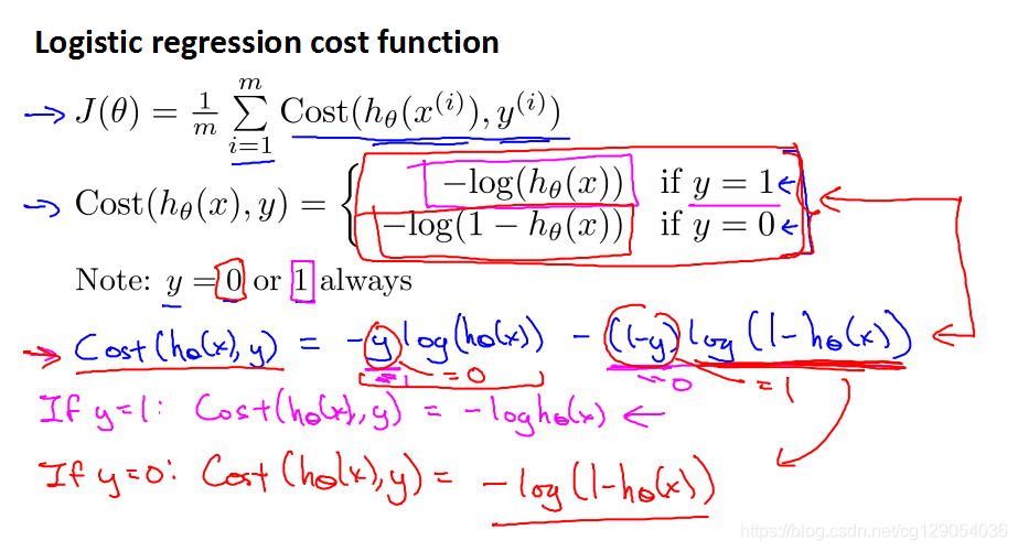 对于任何机器学习算法,我们都要学到它对应的代价函数,回想一下,线性回归模型中,代价函数是所有模型误差的平方和。但是我们在对逻辑函数定义代价函数时,要找到使得代价函数为凸函数的函数。这里直接给出结论,如图所示,
