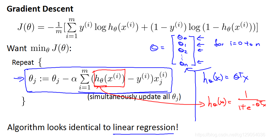 我们还是使用梯度下降法,但你会发现,逻辑回归梯度下降法求得的公式和线性回归函数的形式上一模一样。但要注意的是,这里的预测函数是不一样的,逻辑回归里多了一个逻辑函数。因为它要求输出值在0到1之间。