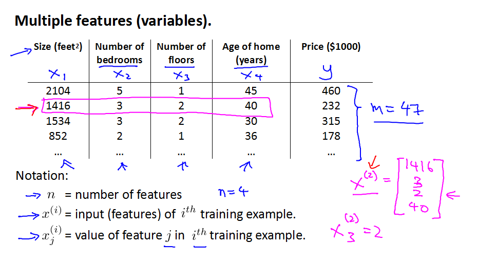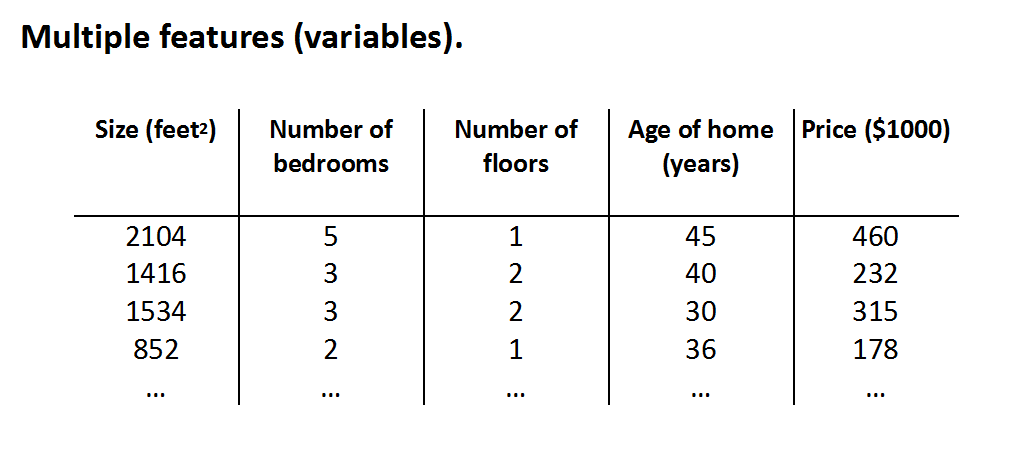 前面我们探讨了单变量的回归模型,现在我们对房价预测模型增加更多的特征,构成一个多变量的模型。