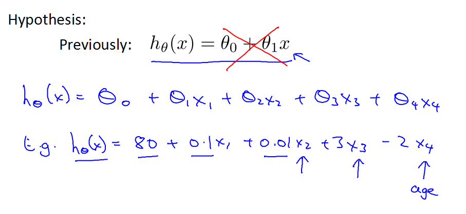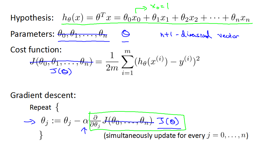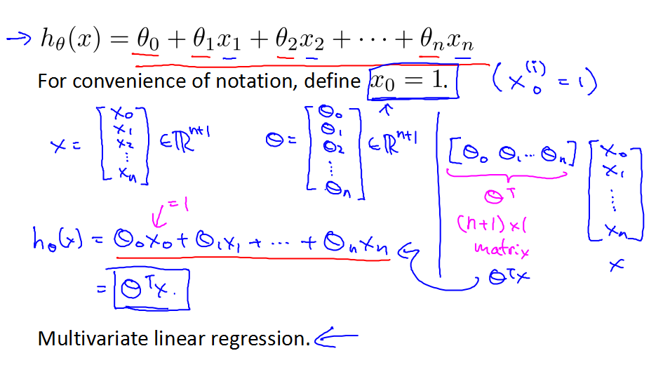 为了方便向量表示,我们定义X0=1,此时预测模型可以写成两个向量相乘,这就是多变量线性回归。