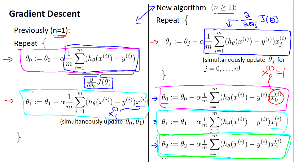 我们把之前的单变量线性回归梯度下降和多变量梯队下降进行比较,如下: