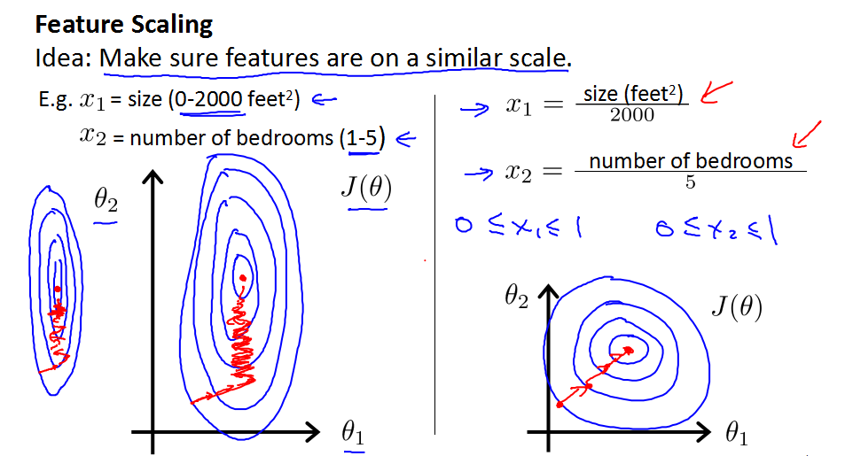 我们希望的是所有特征都具有相近的尺度,这能帮助梯度下降算法更快收敛,下面左边这幅图显示了特征数值范围不一致的时候,收敛速度很慢,而右边这幅图进行缩放之后,收敛速度更快。