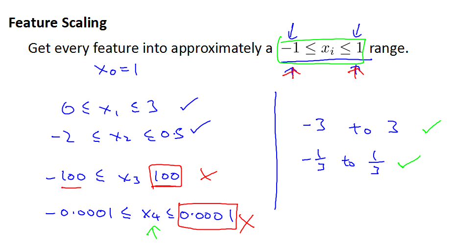 解决办法是尝试使所有特征的尺度都收敛到-1到1之间,如下图所示: