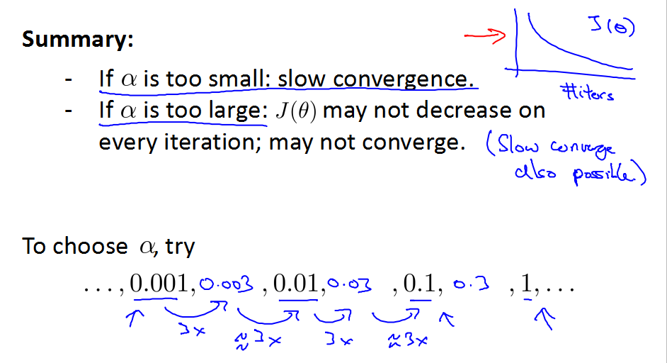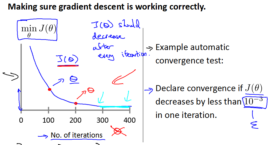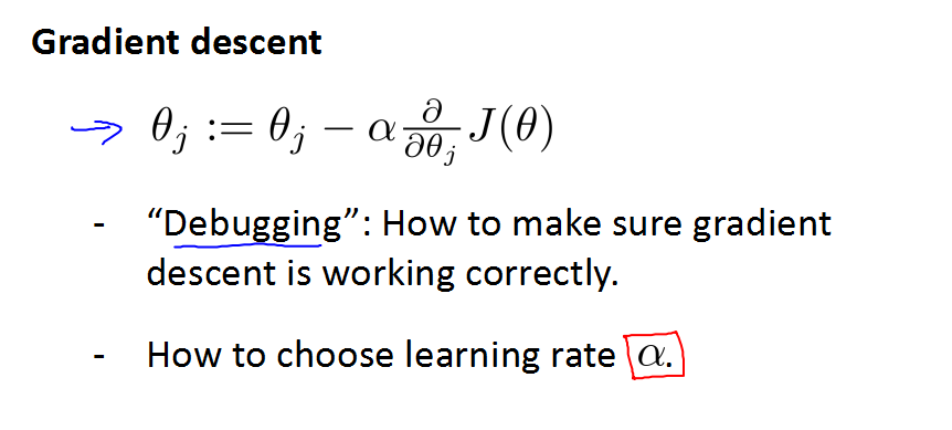 先回顾我们之前的梯度下降算法求参数的公式,我们要决定的是如何选择学习率以及判断我们的梯度下降算法是正确的: